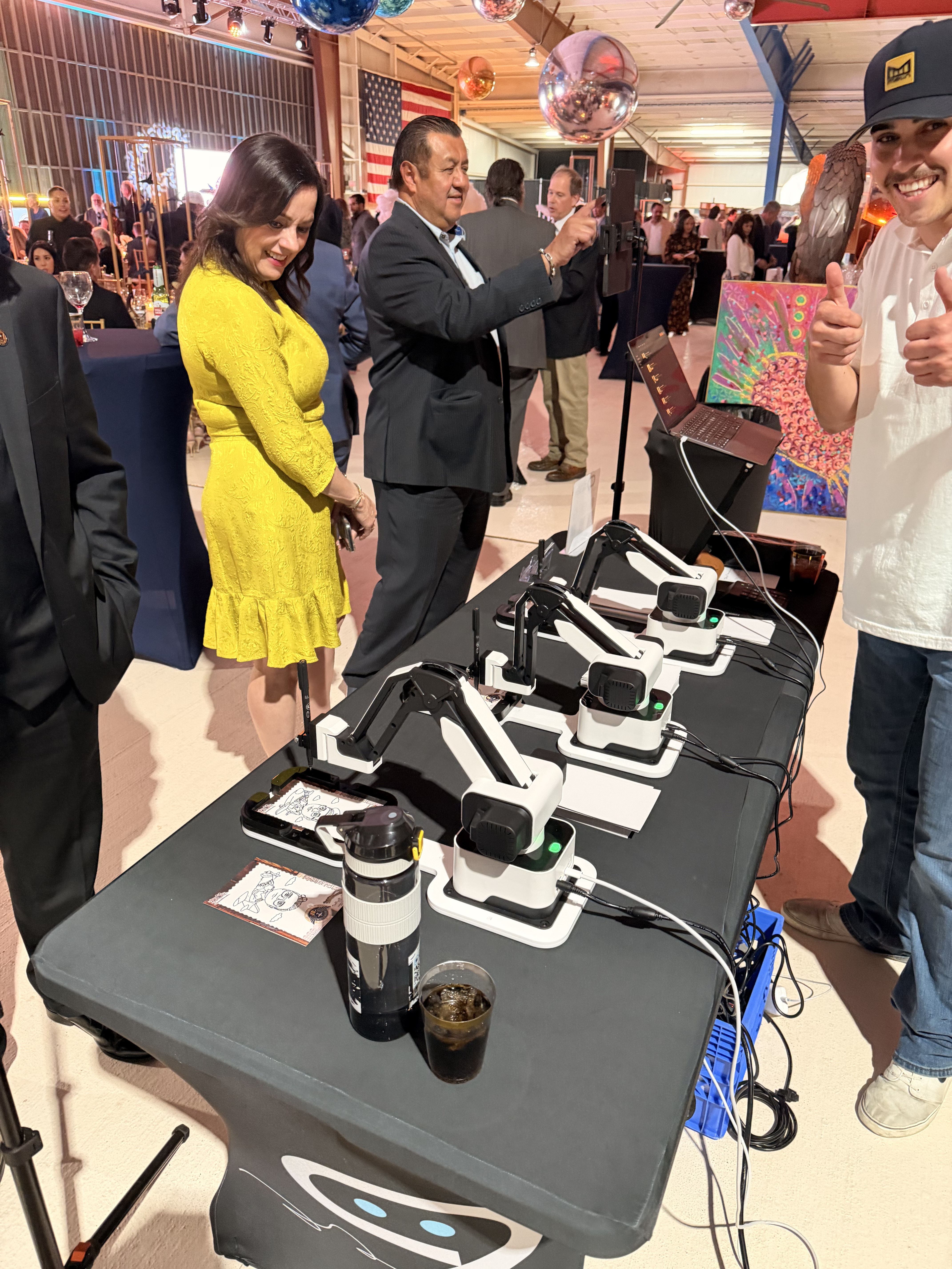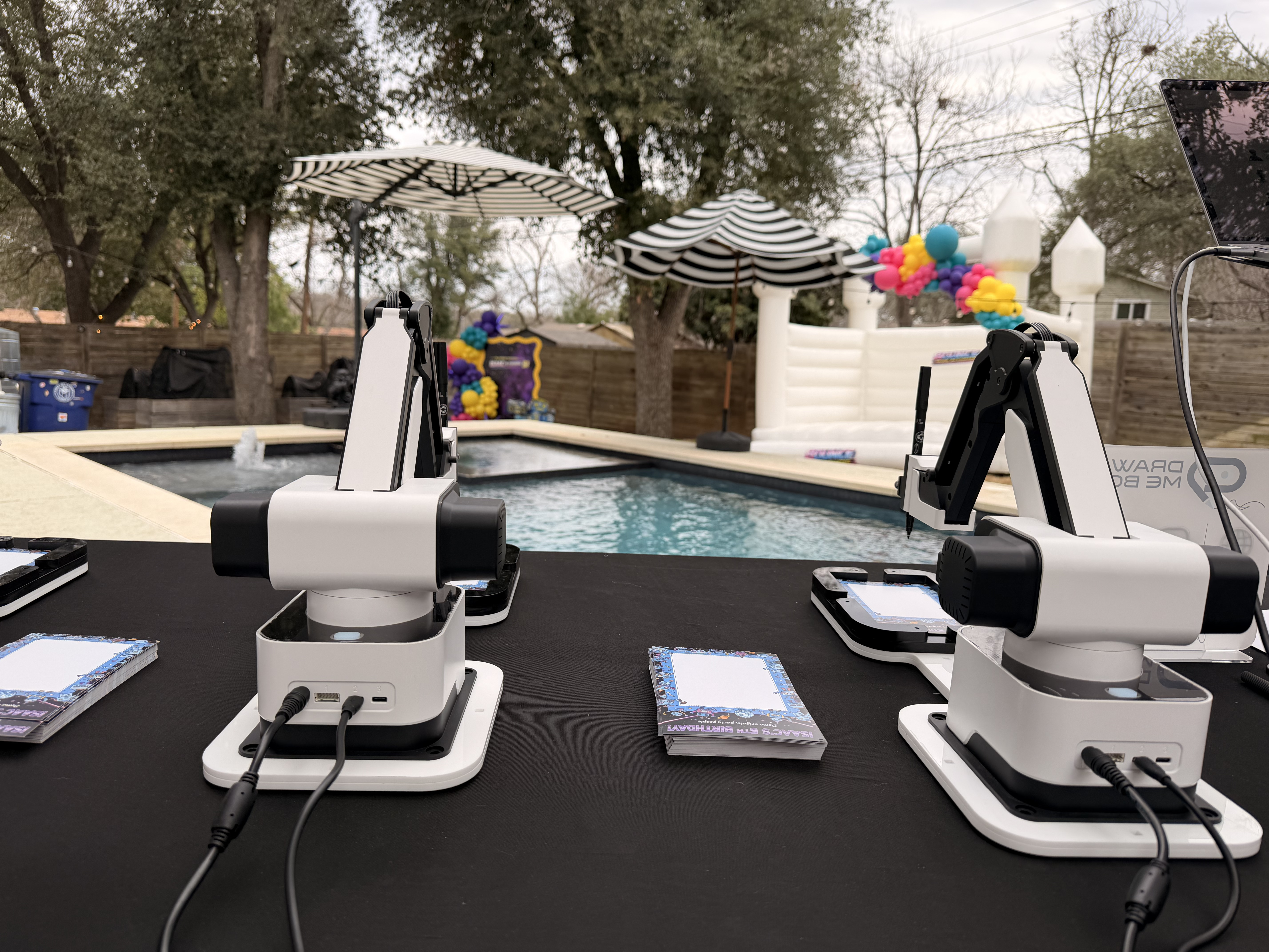 For each event, we'll come prepared with a table, tablecloth, lights, bots, a laptop, and an iPad. The number of bots we bring may vary on the type and size of event, but you can expect either 1 - 3 bots. All we require from you is a working electrical outlet within 10ft of where you want us to set up.